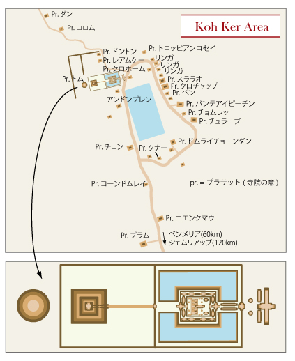 上の地図で拡大されているのが、コーケー遺跡最大にして目玉の「プラサット・トム」です。ピラミッドばかりクローズアップされていますが、正面の遺跡もなかなかのもの。崩壊度合いが激しいのが残念ですが、規模は大きいです。修復の真っ最中のようで、あちらこちらに補強が見られました。